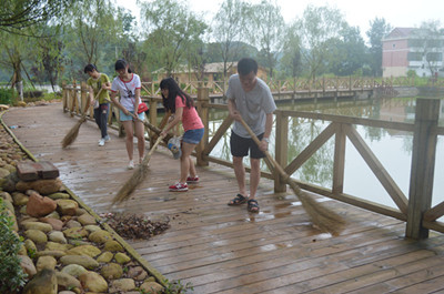 短暂的午饭过后,按照既定安排,我院两支调研服务队将前往高陂镇田北农民画村开展义务清扫活动。据了解,精心打造的唯美画村有“栽下梧桐树,引得凤来栖”之称。但是突然天空下起瓢泼大雨,出于安全考虑,两支调研小组进行适当休整。不等雨停,仍在细雨之时,满怀志愿奉献、迫不及待之情,我们便汇总前往该村,统院“三下乡”成员秉承着不作秀、肯务实的精神,在淅沥小雨中奋力挥动扫帚,在烟雨如画的田北渔村中开辟了一条清洁干净的长路。在汗流浃背中,统院学子一路高歌着完成任务。