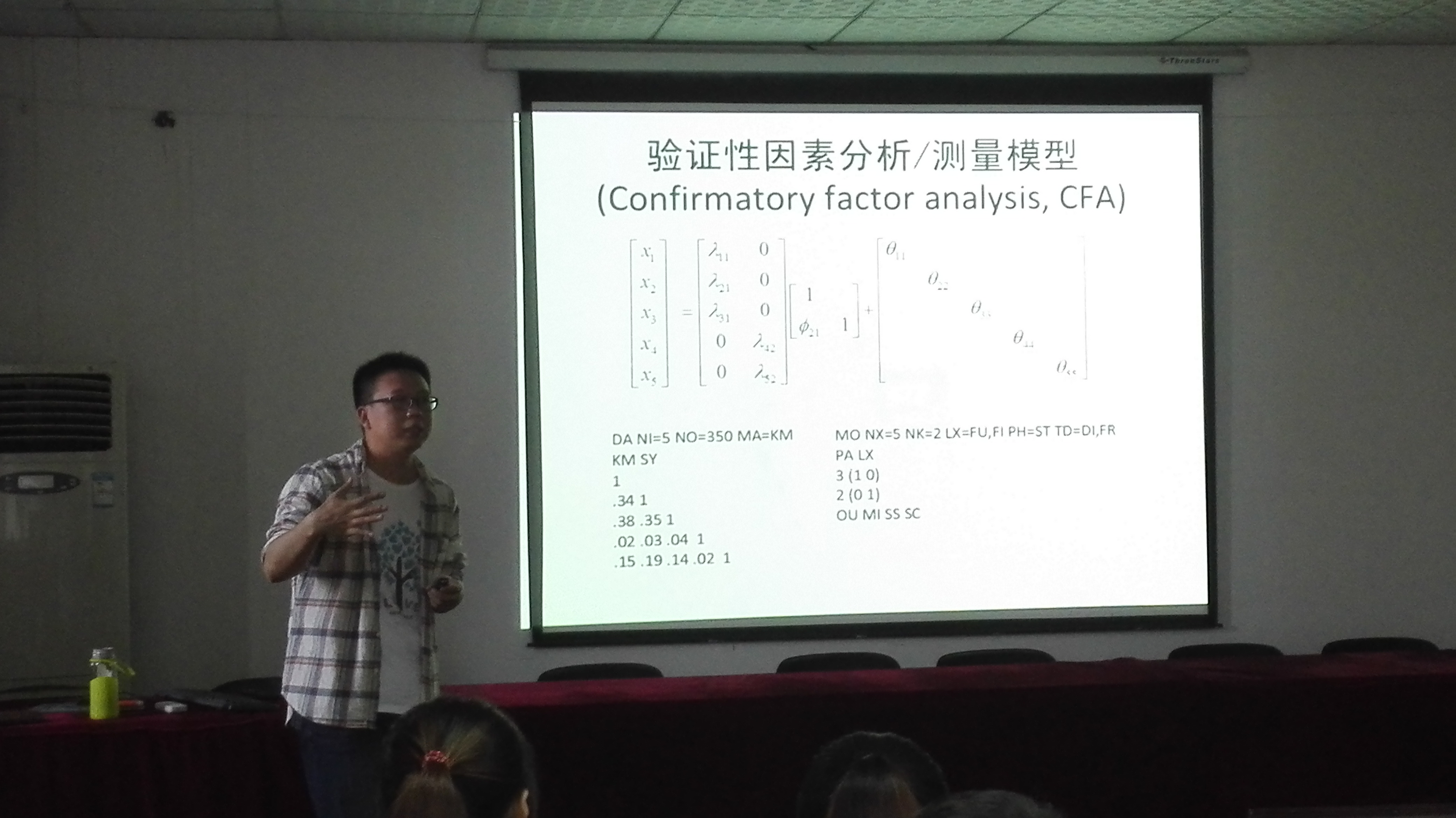 2014年10月9日下午,应我院统计科研创新协会邀请,统计学院李峰博士在第一会议室举办《LISREL软件与结构方程模型》的学术讲座。首先,李峰博士向同学们简单介绍了结构方程模型的中心思想和应用前景,结构方程模型属于多变量统计,是多元数据分析的重要工具,是社会科学、经济、市场、管理等研究领域的重要研究方法之一。然后,以此为基础,李峰博士着重介绍了探索性因素分析(EFA)模型和验证性因素分析(CFA)模型,并风趣幽默的引入了小朋友之间的身体攻击、言语攻击、关系攻击对模型进行通俗易懂的解释,赢来了同学们的阵阵掌声。最后,李峰博士结合LISREL软件和简单实例向同学们展示如何利用软件对模型进行求解,并用图画的形式解释了自变量、因变量、潜变量之间的关系。本次讲座拓宽了同学们的视野,使同学们对这一经典模型有了初步的了解和认识,为今后在这一方面的学习打下了良好的基础。 (文/ 郭�)