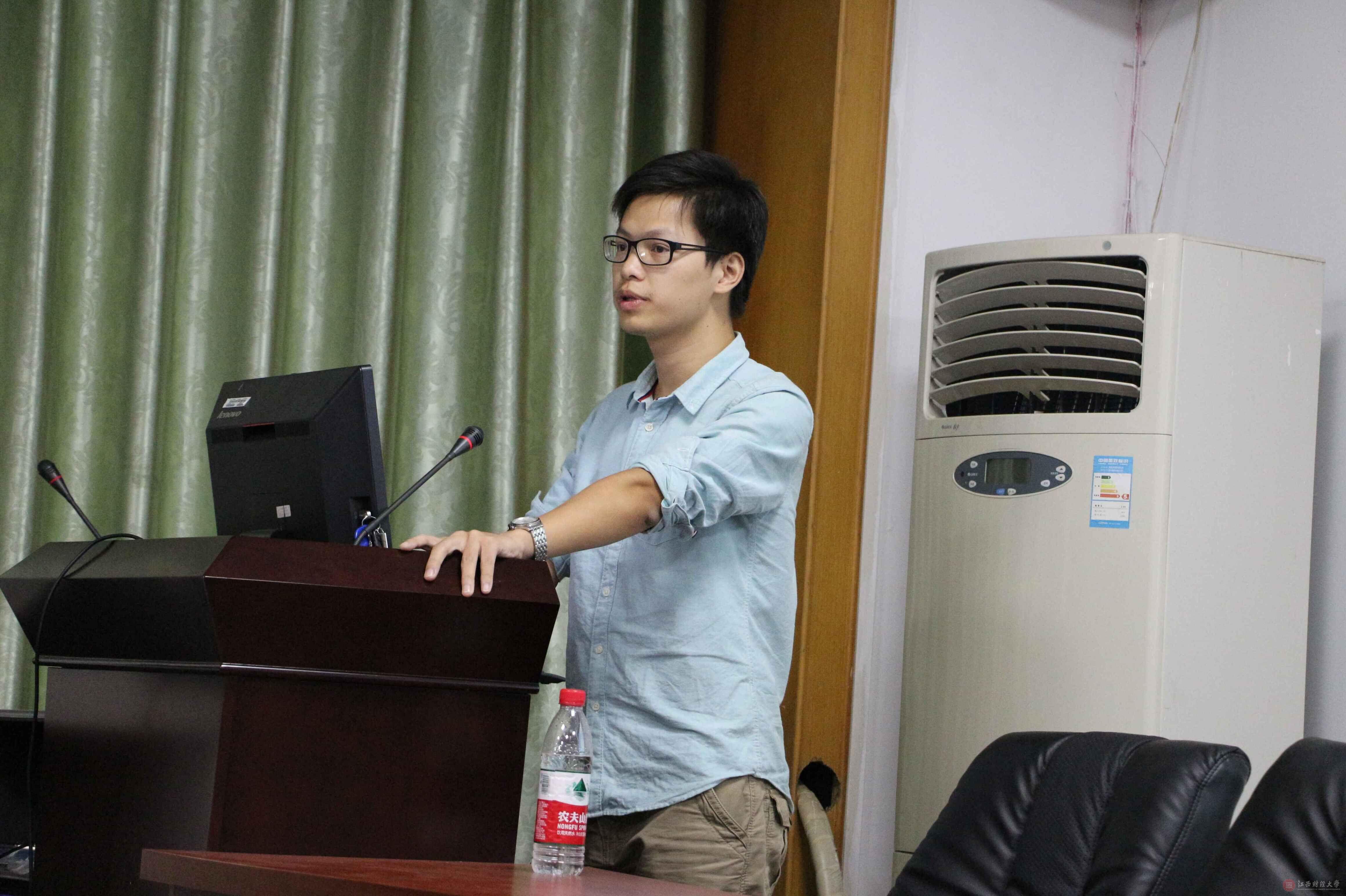 此次会议的特邀嘉宾是江西省挑战杯一等奖、全国商科院校市场调查大赛一等奖的获得者统计学院14级研究生胡双彪。首先,胡双彪从团队组建、确定选题、数据收集、数据整理、数据分析、撰写报告六个方面向同学们系统地讲述了“华创杯”大赛各阶段流程,以及各阶段的详细任务。如选题阶段,应该满足主题明确、角度新颖、范围可行、意义重大。接着,胡双彪向大家分享了以前两次获奖的成果,以及自己在参赛时的个人经验与心得体会。