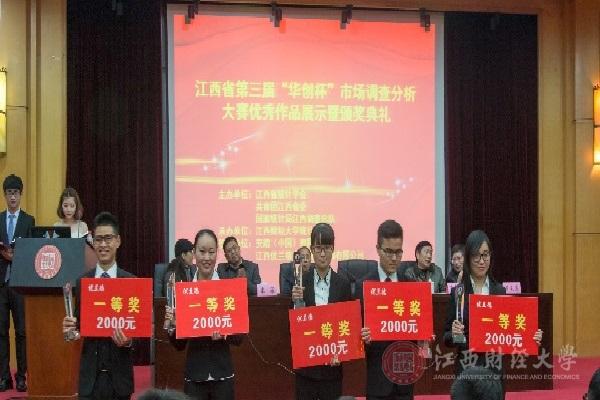 由江西省统计学会、共青团江西省委、国家统计局江西调查总队主办,江西财经大学统计学院承办,安踏(中国)有限公司、江西优兰德市场研究咨询有限公司赞助的江西省第三届“华创杯”市场调查分析大赛优秀作品展示暨颁奖典礼,于12月13日下午两点在江西财经大学网络信息管理中心学术报告厅举行,莅临本次活动的领导有江西省统计局彭道宾巡视员、国家统计局江西调查总队邓盛平总队长、国家统计局江西调查总队刘凡处长,团省委李菲部长、江西财经大学校长助理李良智教授、江西财经大学统计学院院长罗良清教授、江西优兰德市场研究咨询有限公司周水兰董事长。