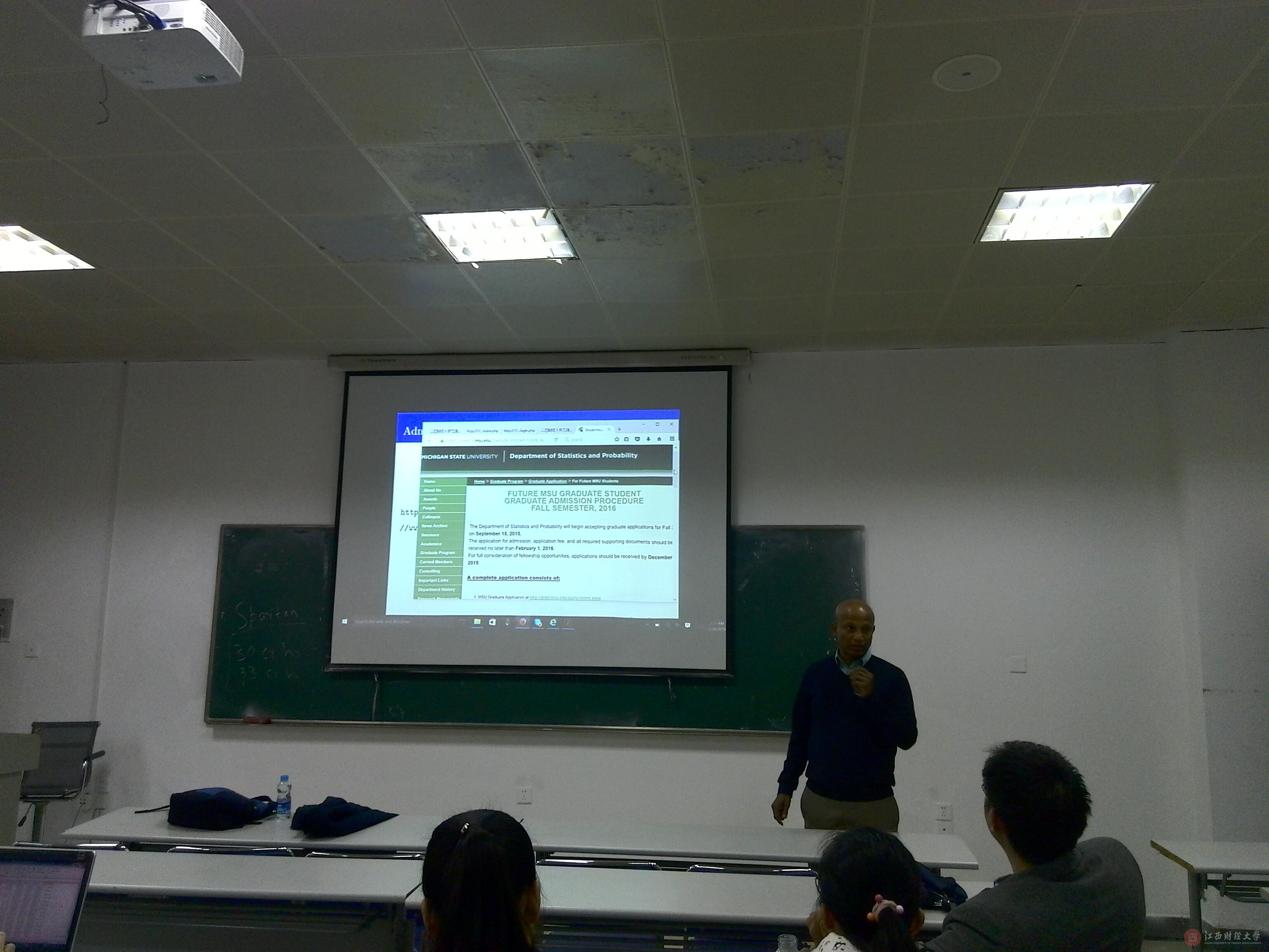 Tapabrata Maiti为美国密歇根州立大学统计与概率学院教授,研究方向为高维数据分析、空间数据分析等。Maiti教授以“small area estimate”, “spatial statistics”, “application for Michigan State University”为主题,向大家详细介绍了“小区域估计”、“空间统计”等几个方面的学术问题。在讲座之余,Maiti教授还向我院研究生们推荐并讲解了如何申请密歇根州立大学的留学项目,并欢迎大家到密歇根州立大学学习。在提问互动环节中,我院师生用英文积极地与Maiti教授进行交流,Maiti教授耐心地解答了师生们提出的问题。