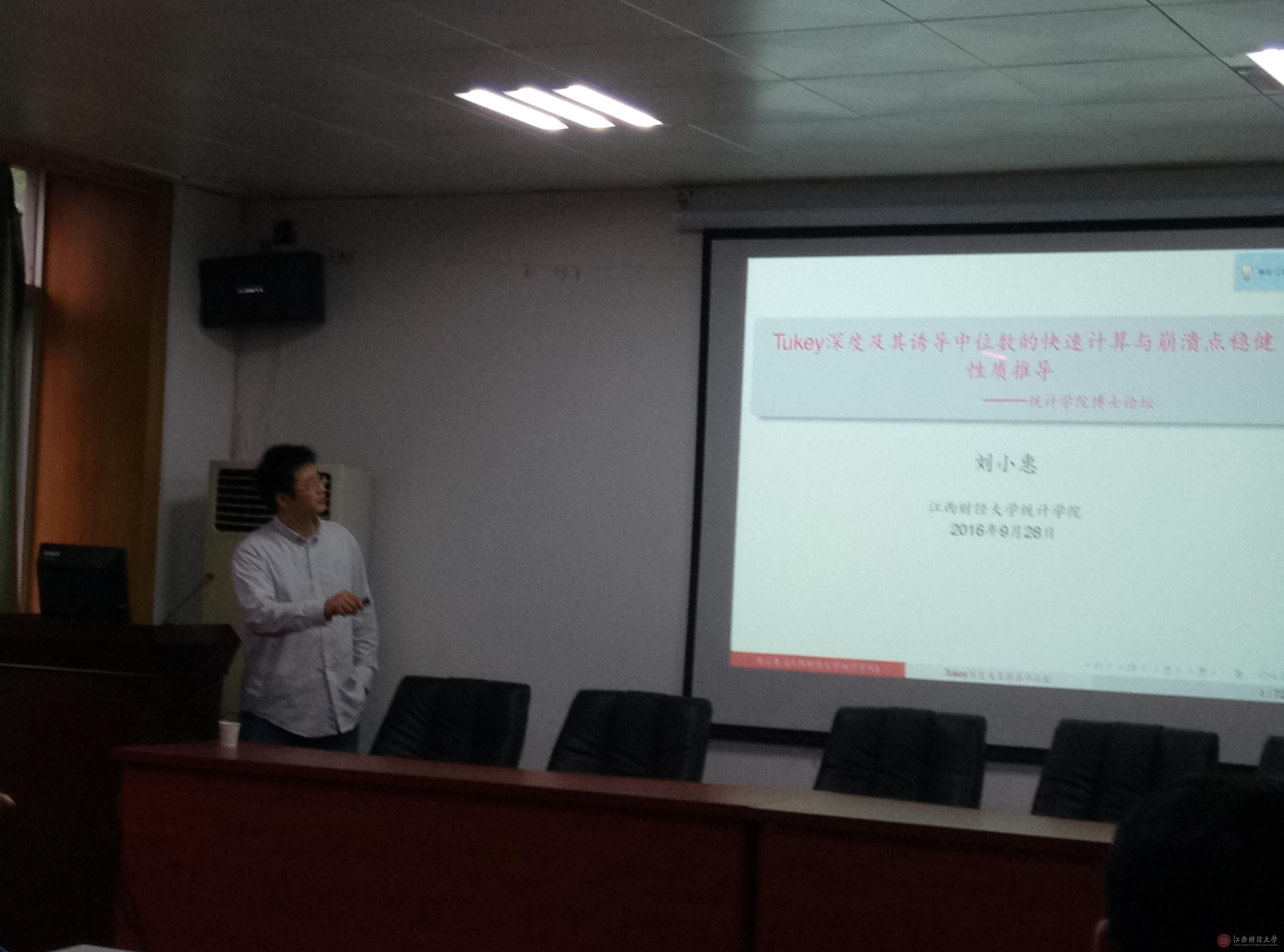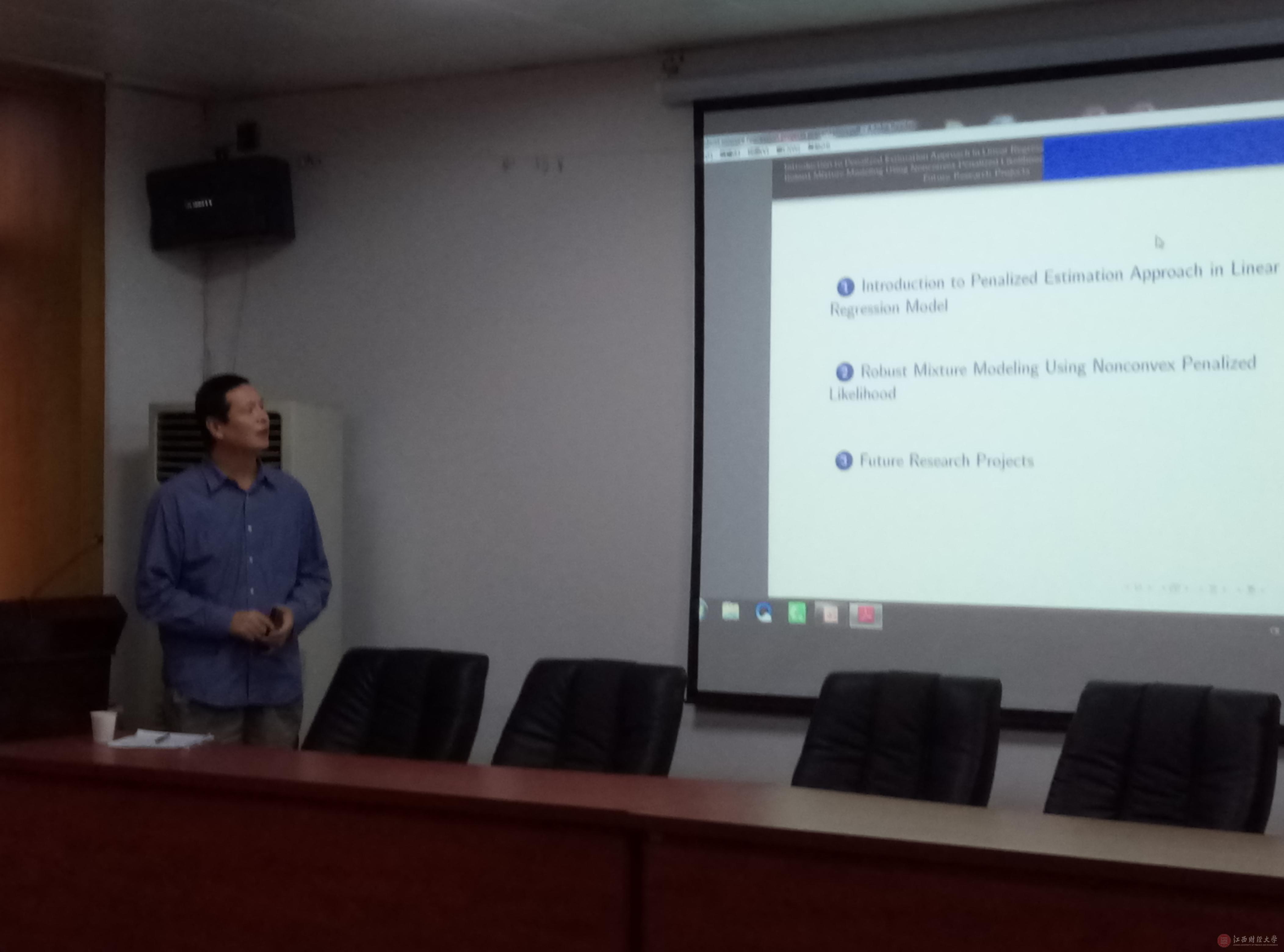 会议伊始,我院青年教师刘小惠就自己所申报的课题与大家进行分享讨论,题为“多输出分位数回归估计中若干问题的研究”,讲解过程中,刘小惠引入TuKey深度及其诱导中位数的快速计算方法,介绍了TuKey深度函数的相关理论知识以及课题中的创新点。此后,我院海归教师余纯结合自己的课题成果也与大家进行了分享,主题为“基于非凸惩罚似然法的混合回归模型稳健型推断”,他将惩罚估计方法引入到混合模型中,并向大家系统地介绍了三种惩罚函数,在提到线性回归的OLS估计时,余纯指出当出现outlter时,则估计值不准确。最后,与会师生就两位教师的课题进行了提问讨论。