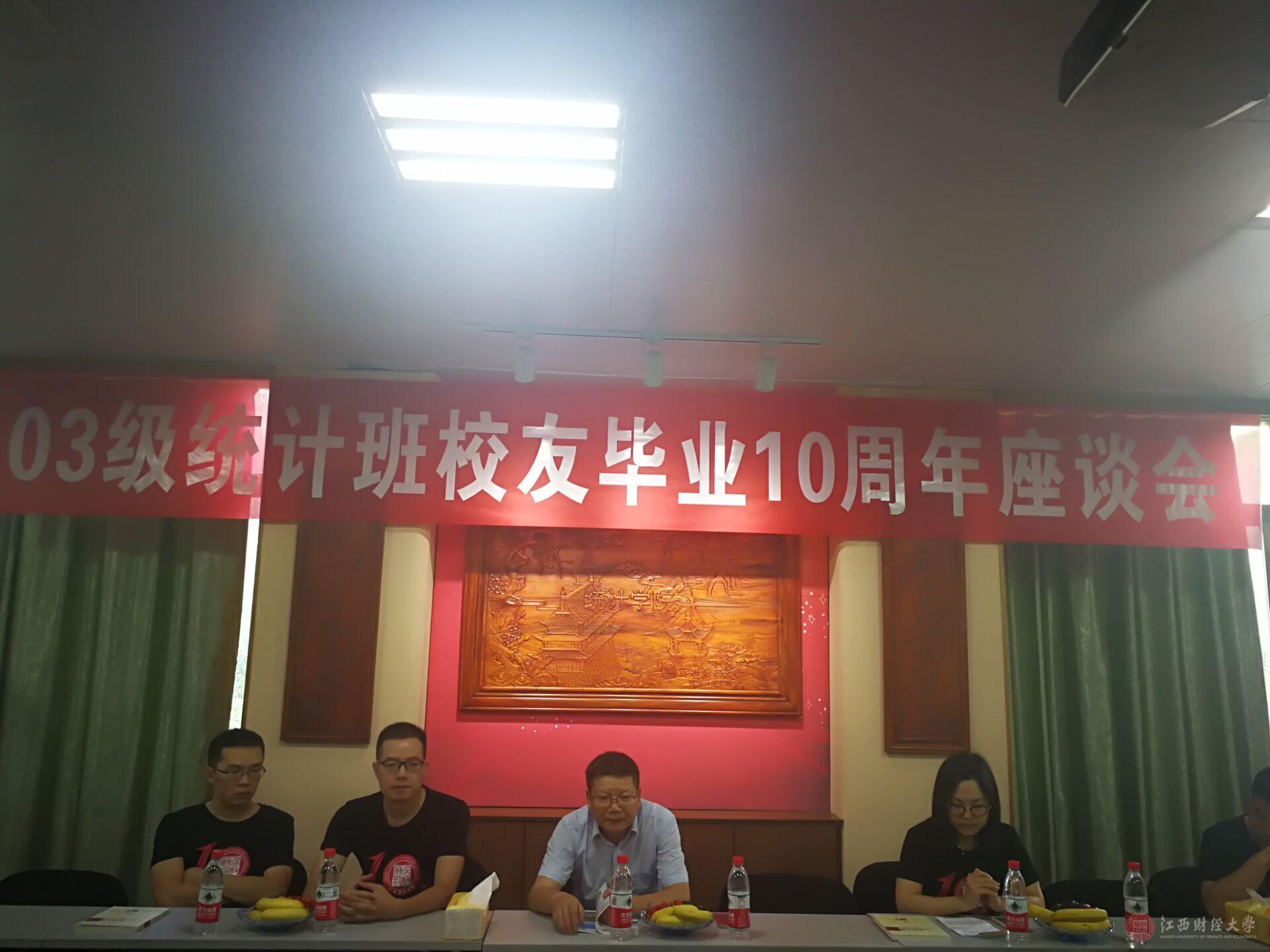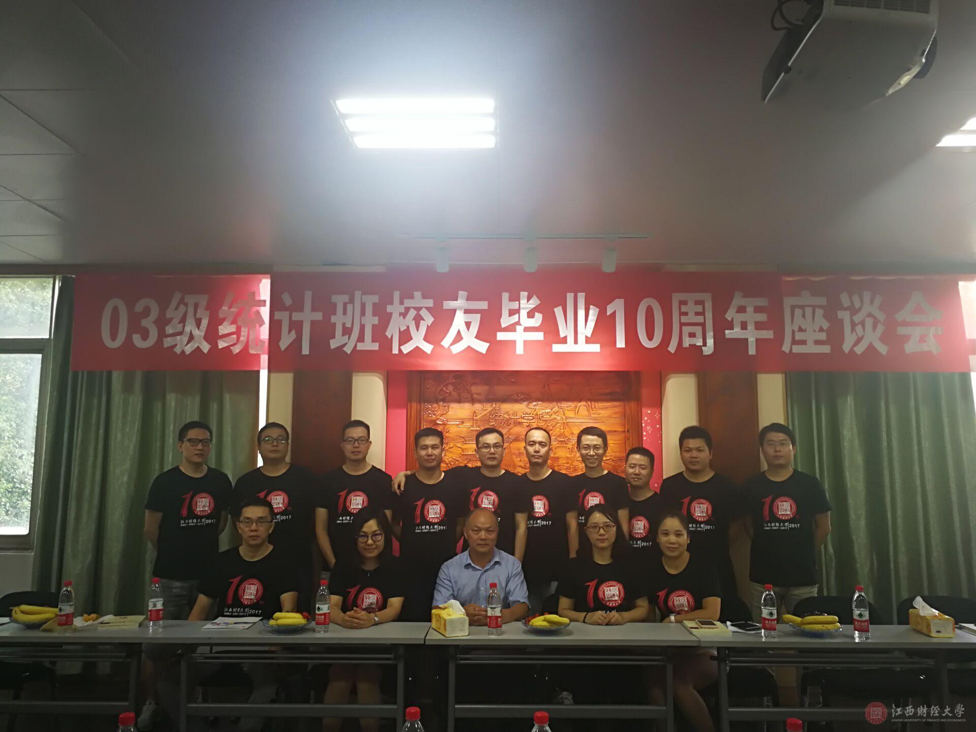 跃马扬鞭国庆期,岁月峥嵘忆山河。2017年10月1日上午,统计学院03级统计班校友毕业10周年座谈会在蛟桥园北区综合楼三楼会议室举行。统计学院院长罗良清教授,03级统计班班主任陈光秀老师出席并和校友们深切交谈,03级统计班冯志鹏等15位校友十年之后重返母校并出席座谈会。