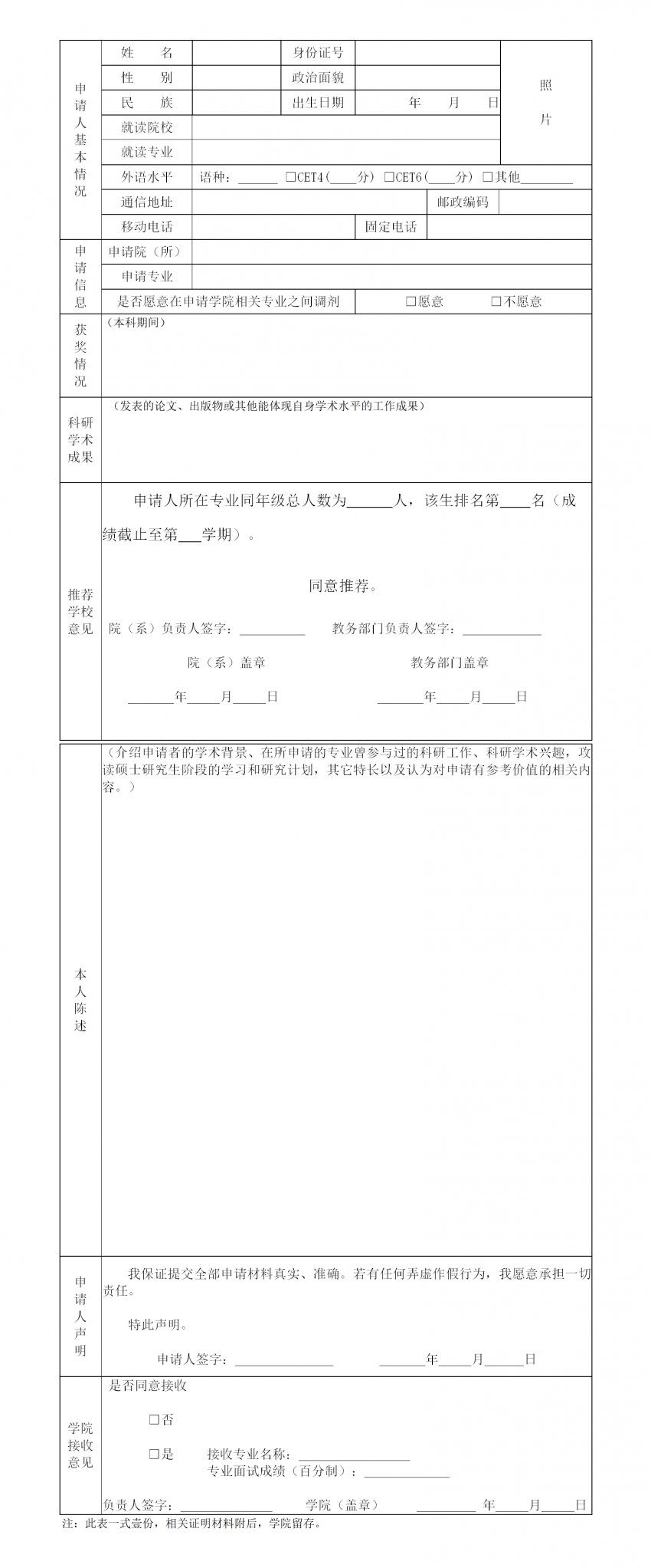 江西财经大学推荐优秀应届本科毕业生免试攻读硕士研究生申请表