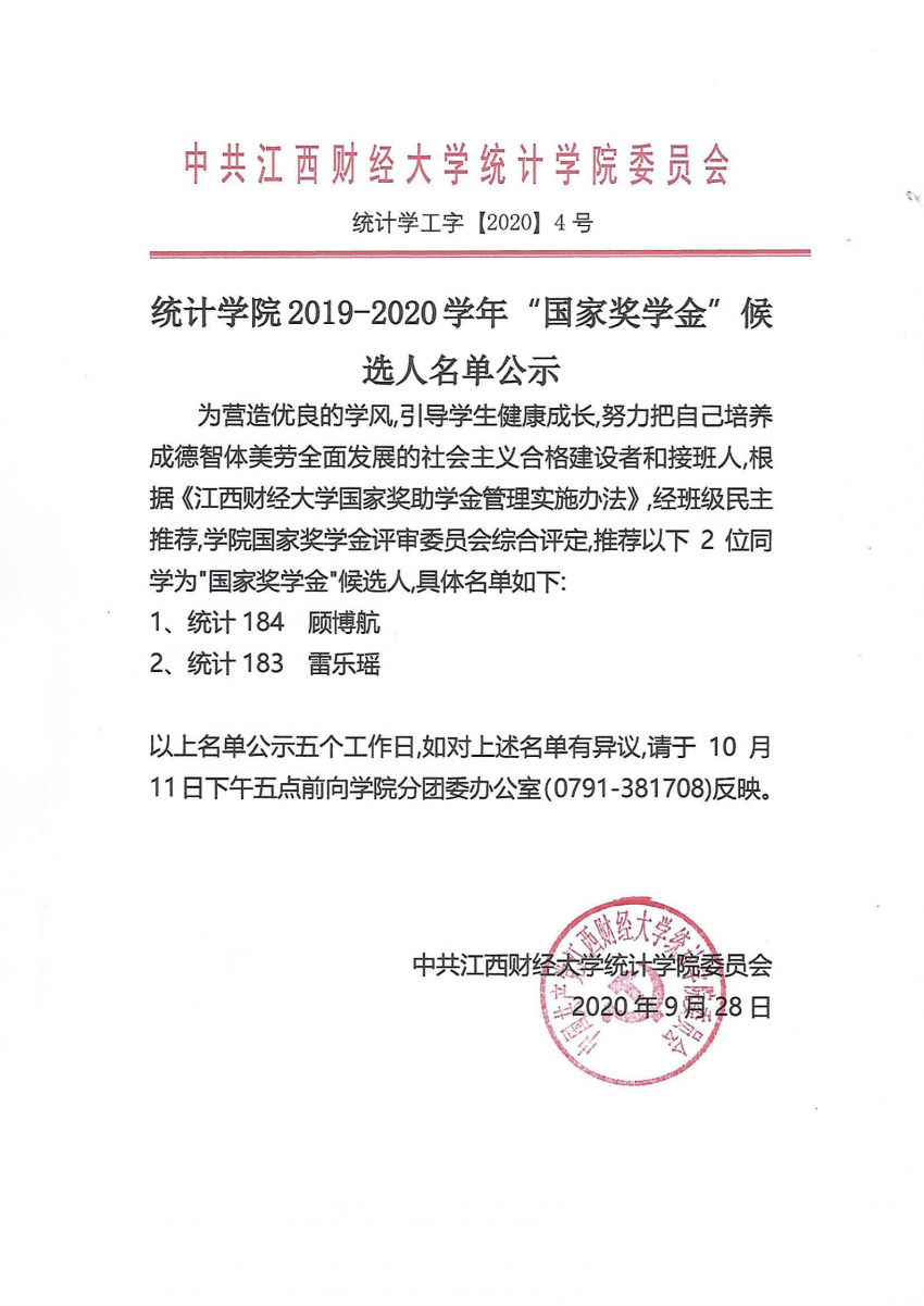 统计学院2019-2020学年“国家奖学金”候选人名单公示