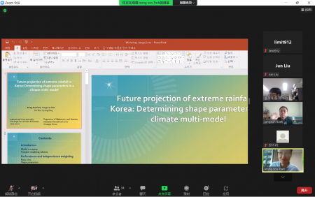 接着,Jeong-Soo Park教授作了题为“Future projection of extreme rainfall in Korea: Determining shape parameters in a climate multi-model ensemble”的报告,介绍了可同时考虑模型性能和独立性的模型加权方法。在报告中,Jeong-Soo Park教授详细讲解了如何基于卡方统计量和熵选择两个形状参数的简单方法来降低计算难度。与此同时,他还结合了东亚五个气候变量的21个CMIP6(耦合模型比对项目第6阶段)模型,详细展示了一番其在获得朝鲜半岛极端降雨未来预测方面的应用。