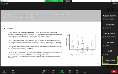 在上午的全南国立大学报告场,全南国立大学资深统计学教授Jangsun Baek首先做了题为“Variational autoencoder with Manly transformation for clustering high-dimensional data”的报告。通过分析现有生成模型所存在的不足,Baek教授引入了一种新的可处理厚尾、对异常值稳健,且有利于使用低维可视化工具进行展示的高维聚类方法,并展现了相关的应用。