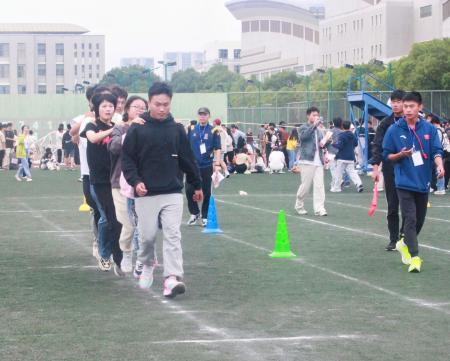 草坪上,裁判哨声响起,红旗挥下,30米火车跑参赛选手们手连着手,脚连着脚,伴随整齐的口号,迈着稳健的步伐,一步步奔向终点。一支由十人组成的队伍,团结一心,咬牙坚持,稳中求快,最终以16.83秒的成绩获得第五名,体现了更高更快更强的体育精神。
