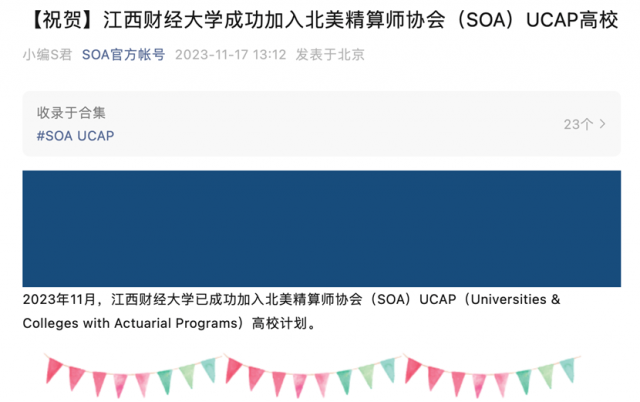 11月17日,北美精算师协会(Society of Actuaries,简称SOA)官方网站公布,江西财经大学成功申请加入北美精算师协会(SOA)的UCAP高校计划,这是我校统计与数据科学学院建设精算学专业的一项重要成果,也标志着我校精算学专业的本科国际化教育已获得国际认可。