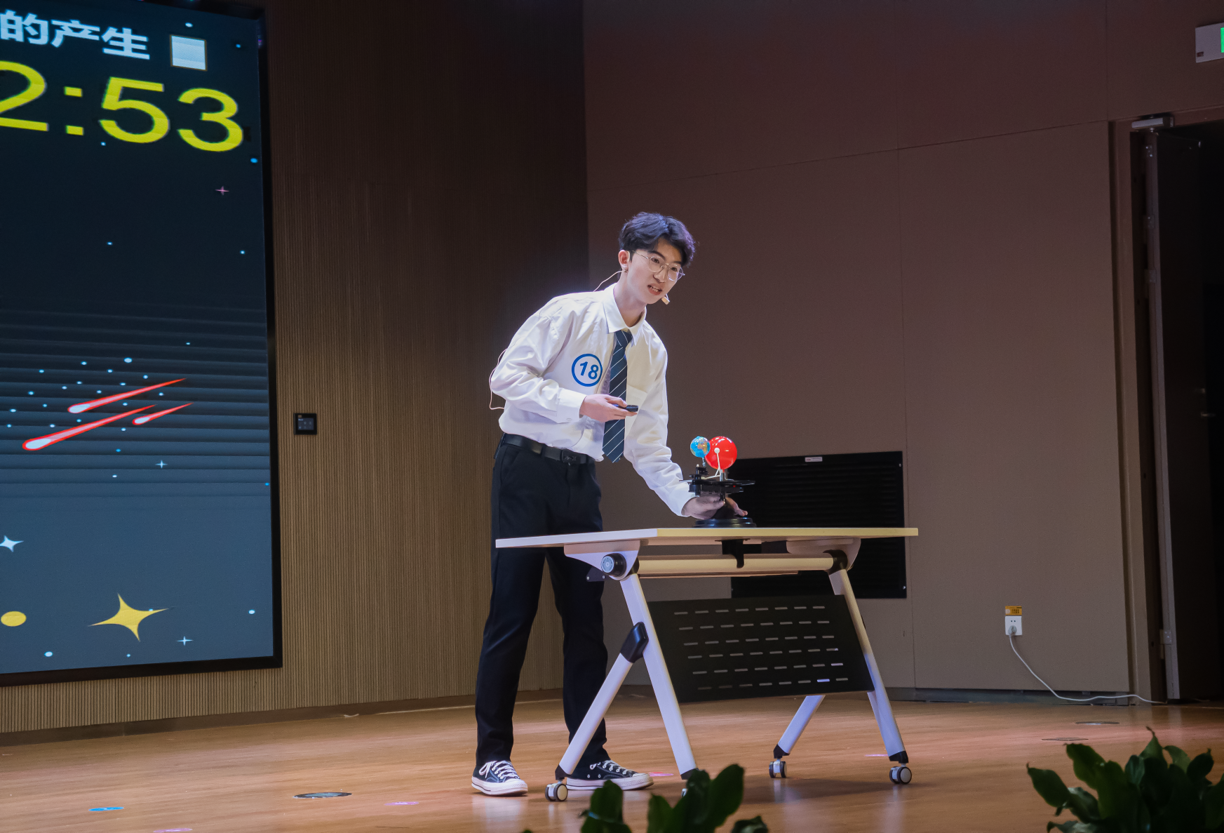 讲解的开始,王孜卓从最近的地磁暴事件切入主题,先后阐述了地磁暴的概念、由来以及对生活产生的双重影响。他通过引用网友们幽默的评论和生动的比喻让原本复杂难懂的科学知识变得形象起来,大量实例的列举也让观众们平时觉得遥不可及的物理现象变得立体可感。他在由浅入深的层层讲解中点出主题,最后揭开了观众们想知道的谜底——地磁暴并不是导致头痛的直接原因。比赛现场氛围轻松活跃,王孜卓的讲解不仅展现出他扎实的科学知识和清晰的逻辑思维,幽默风趣的讲解风格也博得了现场观众的阵阵掌声和一致好评。