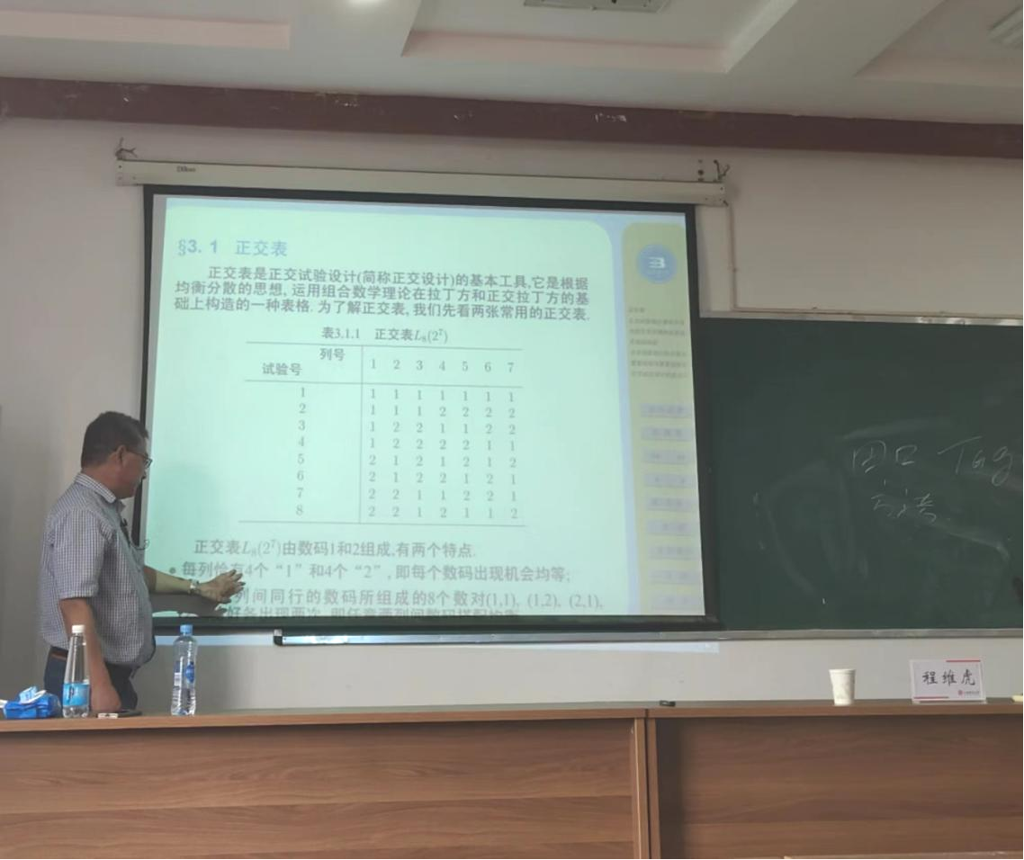 26日下午,程教授围绕正交试验设计展开授课。首先,程教授从背景出发初步介绍了正交试验,并就正交表的结构和类型对其基本工具做出详细讲解。他指出正交表是根据均衡分散的思想,运用组合数学理论在拉丁方和正交拉丁方的基础上构造的一种表格。随后,程教授通过实例对没有考虑交互作用和考虑交互作用的正交试验设计进行了生动的讲解。同时,他从综合平衡法和综合评分法两方面以实例分析了多指标试验。最后,程教授引入方差分析法对直观分析法的不足进行补充说明,他指出该方法可以分析误差精度并对原理进行细致的解读。