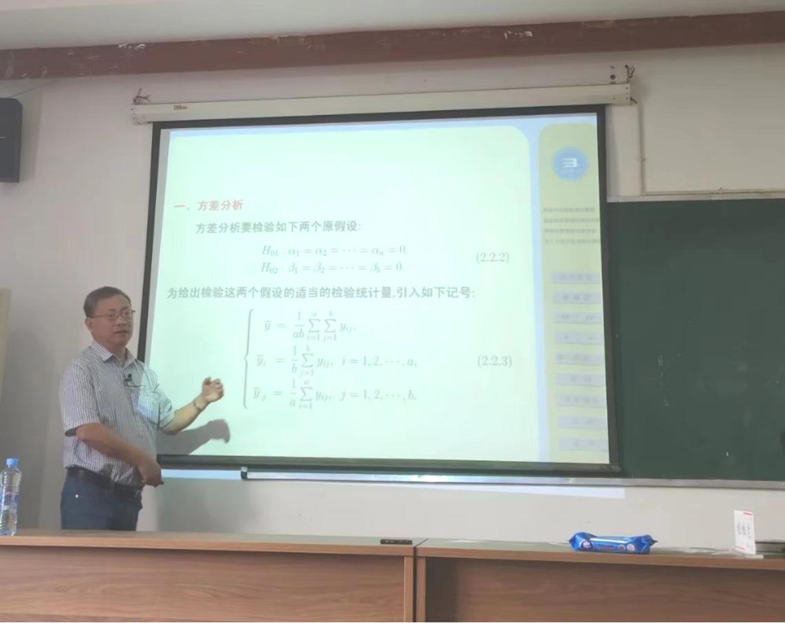 4月26日上午,程教授首先对可加效应和交互效应的固定效应模型进行讲解,分别从模型结构、条件和统计分析方法三方面进行理论分析,然后运用“松树”、“电池”等实例对模型的统计分析进行生动刻画。然后,他对随机效应模型的统计分析进行了细致解说,他表明该模型适用于存在多水平的因子试验。同时将该模型与固定效应、混合效应模型进行对比,强调它们分别的适用条件。最后,程教授用实例对拉丁方设计进行了形象的解释,指出该方法能解决多因子实验模型问题。