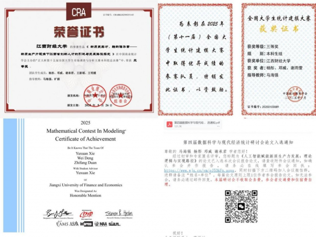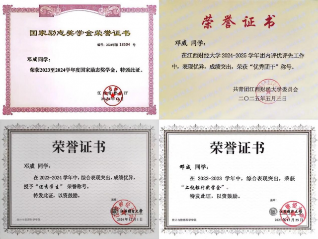 个人简介:邓威,男,中共党员,统计与数据科学学院应用统计学2022级学生。大学四年加权成绩90.2,专业第五。曾任班级班长、统计与数据科学学院乒乓球队队长和《数学分析》课程助教等职。曾获全国大学生市场调查与分析大赛本科组国家级三等奖、全国大学生统计建模大赛国家级三等奖及江西赛区一等奖、“华创杯”市场调研分析大赛二等奖和三等奖、美国大学生数学建模竞赛(MCM)Honorable Mention奖。在校期间荣获优秀团员、优秀团干、优秀学生、优秀学生干部、公益之星等共计7项个人荣誉称号,斩获国家励志奖学金、两项“江财之友”奖学金、两项二等奖学金、公益之星专项奖学金等6项奖学金。现保研至中南财经政法大学应用统计专硕。