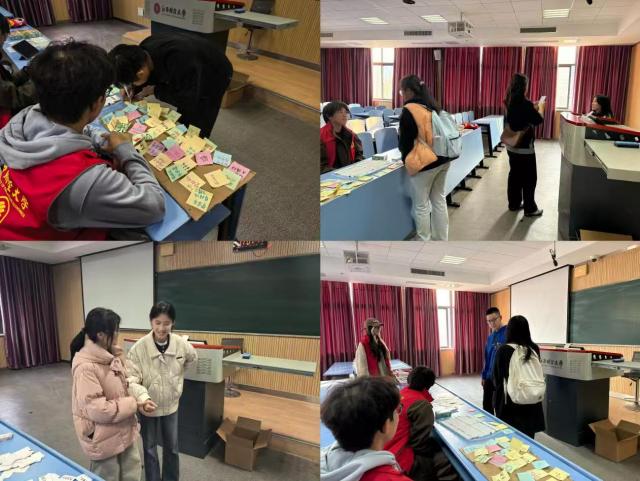 本次活动采用“盲盒抽取+快闪体验”的模式,不仅降低了参与门槛,也能够以轻松有趣的方式传播志愿精神。活动现场气氛热烈,参与者有序签到后,领取“志愿能量卡”与便利贴,随即从“志愿盲盒”中抽取任务卡,自主选择多个主题进行体验。在“Emoji猜志愿”区,同学们用生动的表情与肢体语言演绎垃圾分类等场景,队友们心有灵犀,踊跃抢答;在“微光承诺墙”前,大家纷纷在便利贴上写下志愿服务承诺,一张张便利贴在空白的墙上点缀勾勒,汇聚成一片温暖的“微光森林”,传递着奉献的温暖温度;在“志愿瞬间重现”环节中,同学们通过情景模仿,生动演绎了帮助老人等暖心场景,在互动中感悟了志愿服务的真谛。