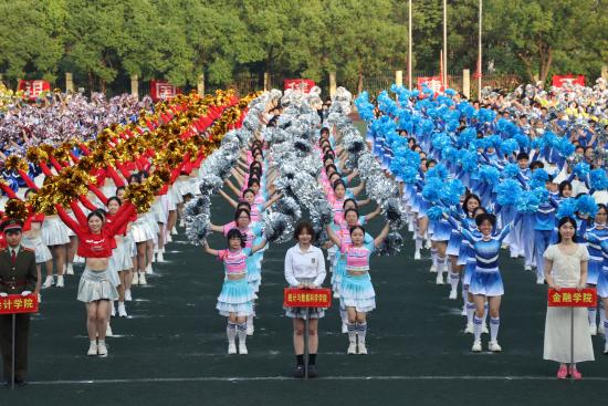 在主持人激昂的解说中,方队坚定地迈向主席台。“统天统地,壮我统计;计山计水,心系社稷”,嘹亮的口号彰显出统计青年们恢宏的士气,热烈的气氛充斥着整个田径场。