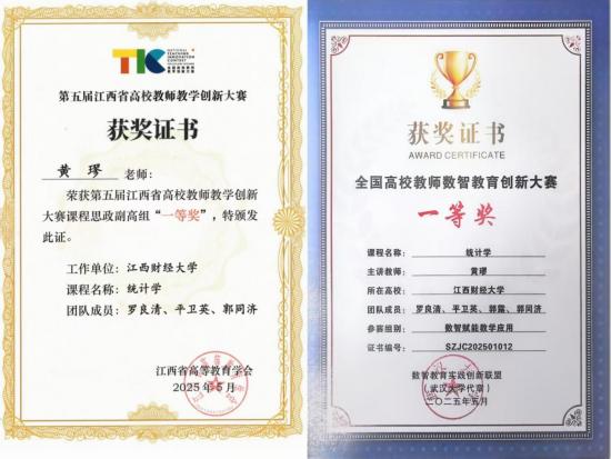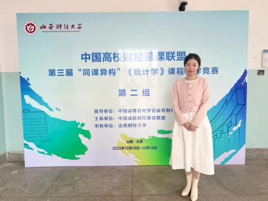 “三尺讲台勤耕耘,一片匠心竞芳华。” 黄璆不仅在日常工作中以“润物细无声”的方式培育学生,在教学竞赛的舞台上更是绽放光彩。近期,她在中国高校财经慕课联盟第三届“同课异构”教学竞赛的《统计学》课程竞赛中斩获一等奖,这一成绩既是对她扎实教学功底的充分认可,更彰显了她灵活创新的课堂呈现智慧。