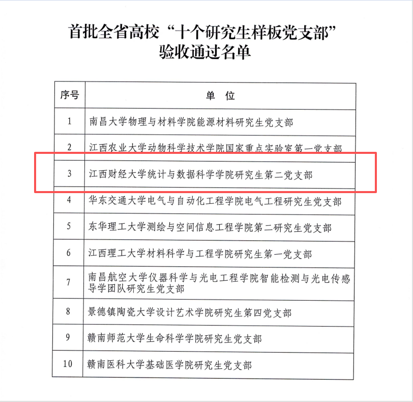 近日,中共江西省委教育工委组织部公布首批全省高校“十个研究生样板党支部”创建培育验收结果,我院研究生第二党支部顺利通过验收。
