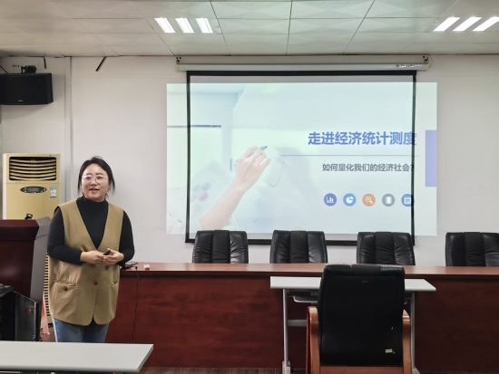 讲座中,王佳以“量化经济社会”为核心主线,系统阐释了经济统计测度的本质与价值。她指出,经济统计测度就是用科学方法将抽象复杂的社会经济现象转化为精准可对比的数据,既是认知社会的客观工具,也是宏观决策、国际比较的重要依据。结合邱东教授“三基思想”,她深入讲解了经济统计测度的四大底层逻辑:从抽象概念到具象指标的转化、科学统计体系的构建、规范的数据收集与分析,以及从个体到总体的科学加总,让同学们清晰把握统计测度的完整链条。
